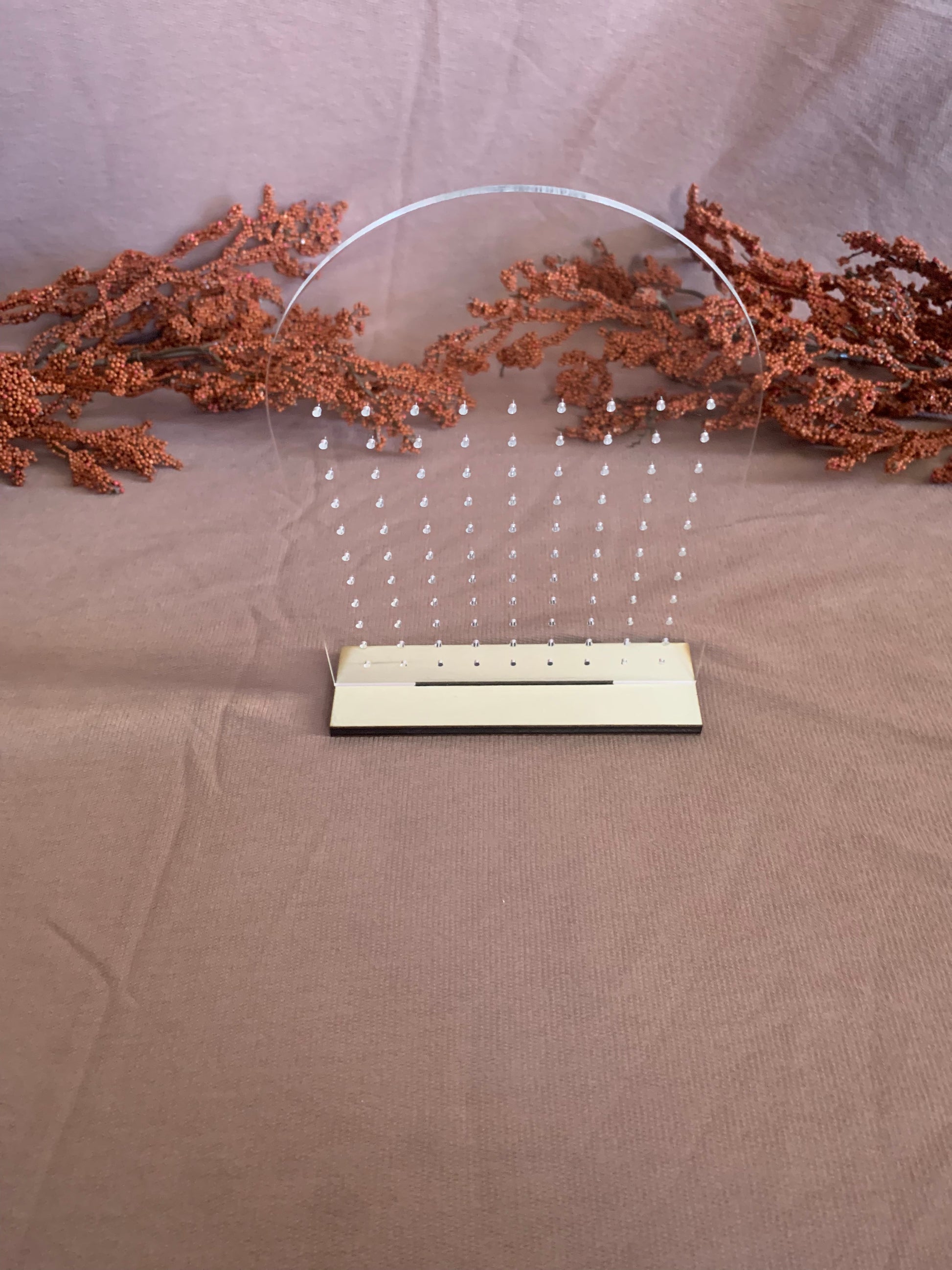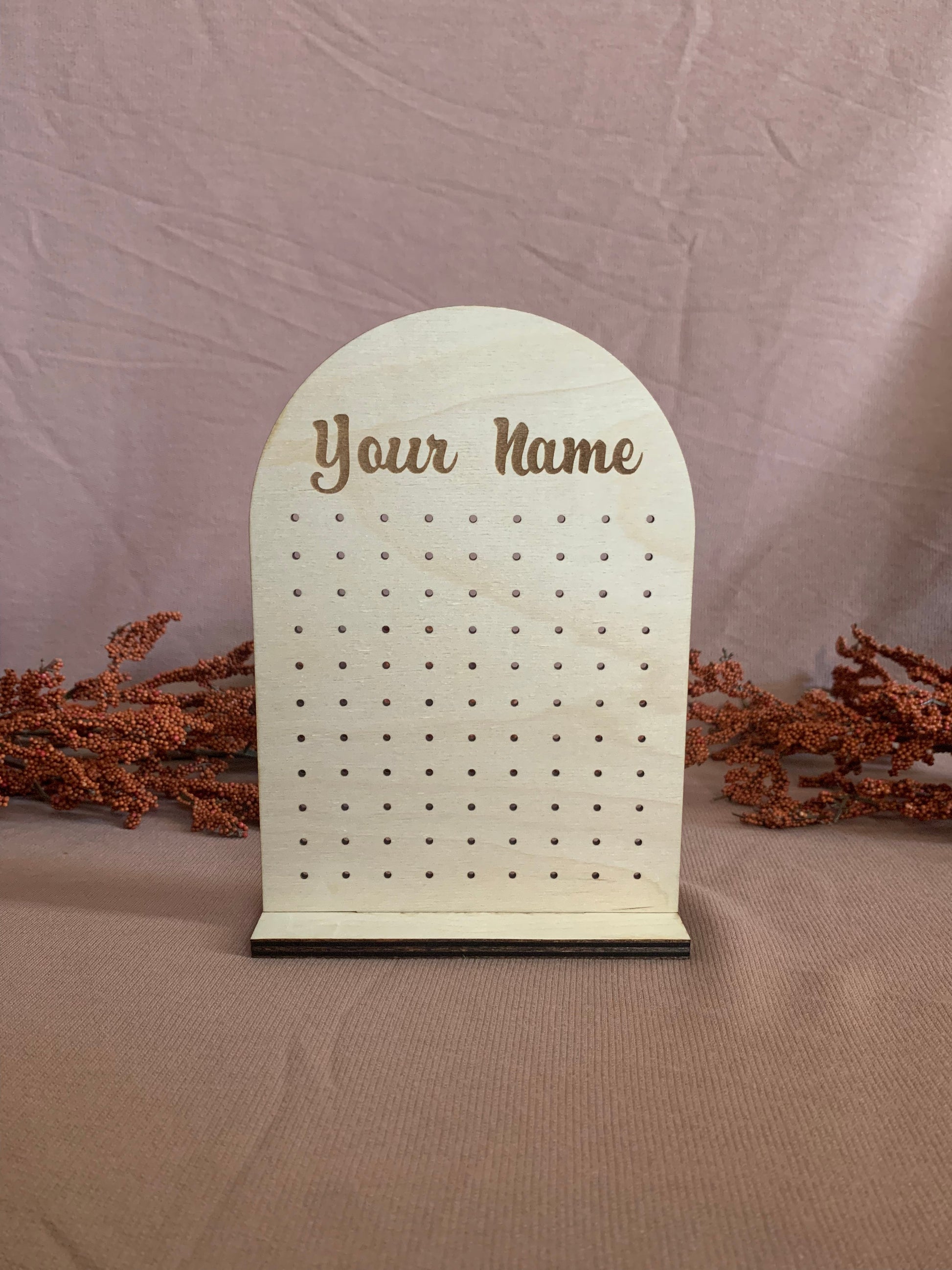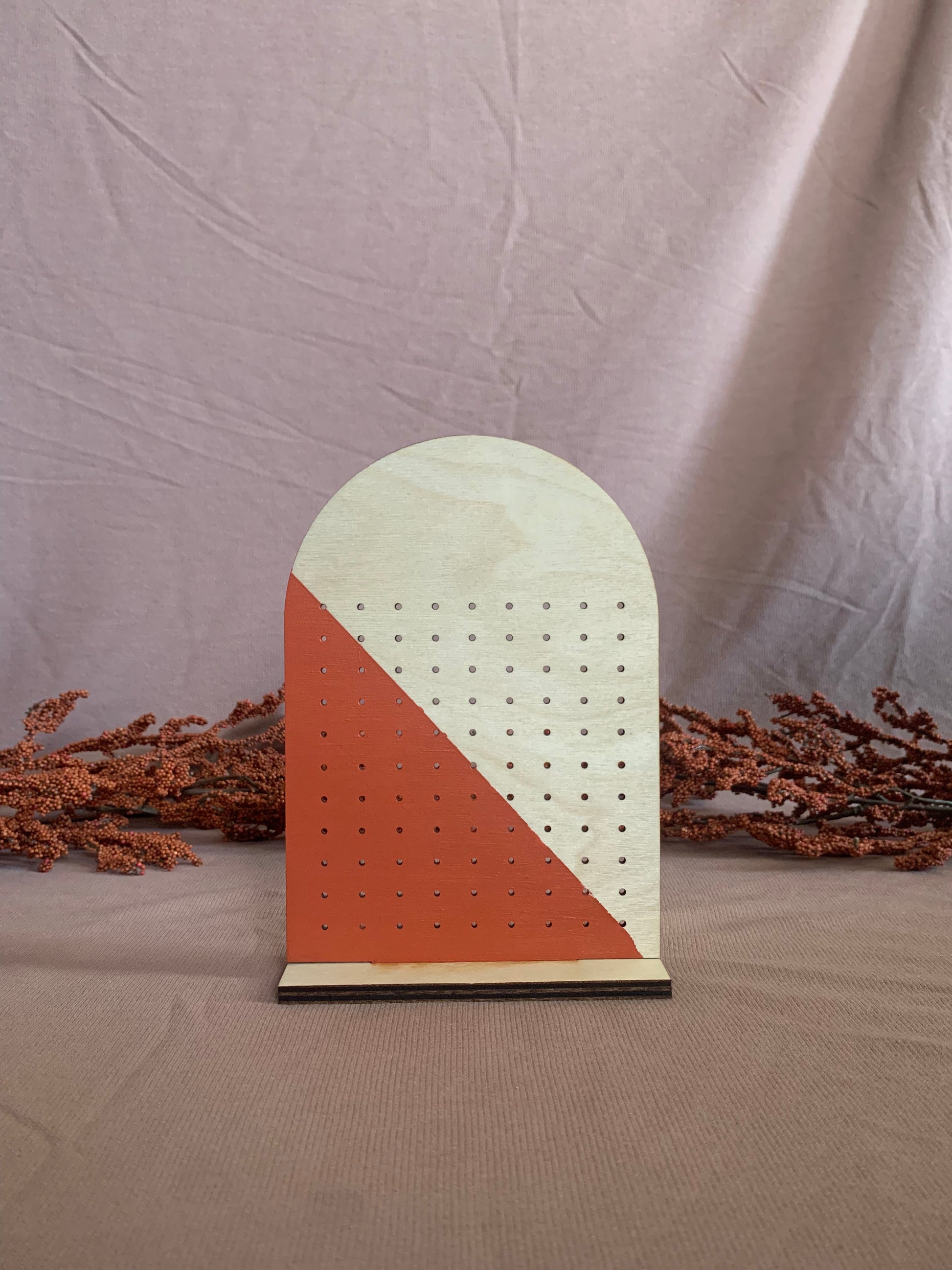 Small arched earring stand with 99 openings for earrings.  Small earrings can be placed side by side and larger earrings can be spaced out.