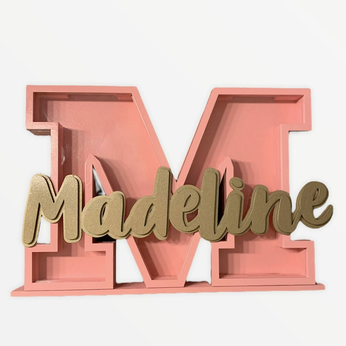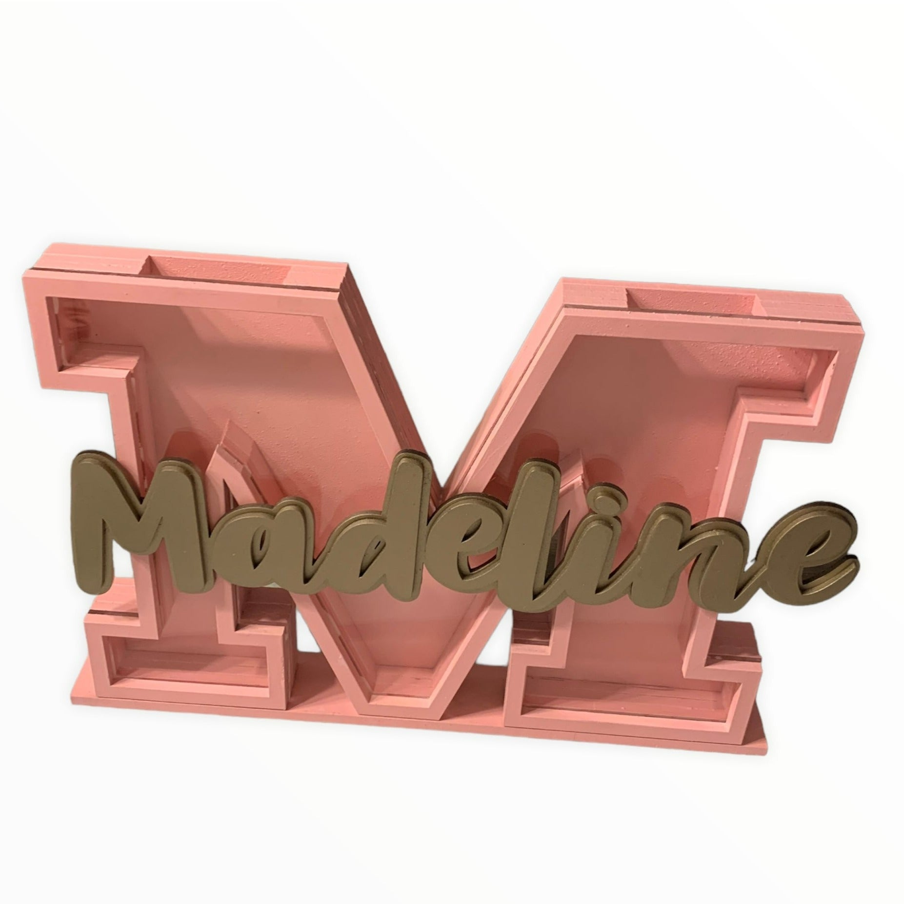 Customize your letter bank with letters starting from A-Z with your first name added. These banks can fit coins and bills. To remove coins or bills turn bank upside down to remove money from openings at the top of the banks. To prevent bills from getting stuck, fold bills small.