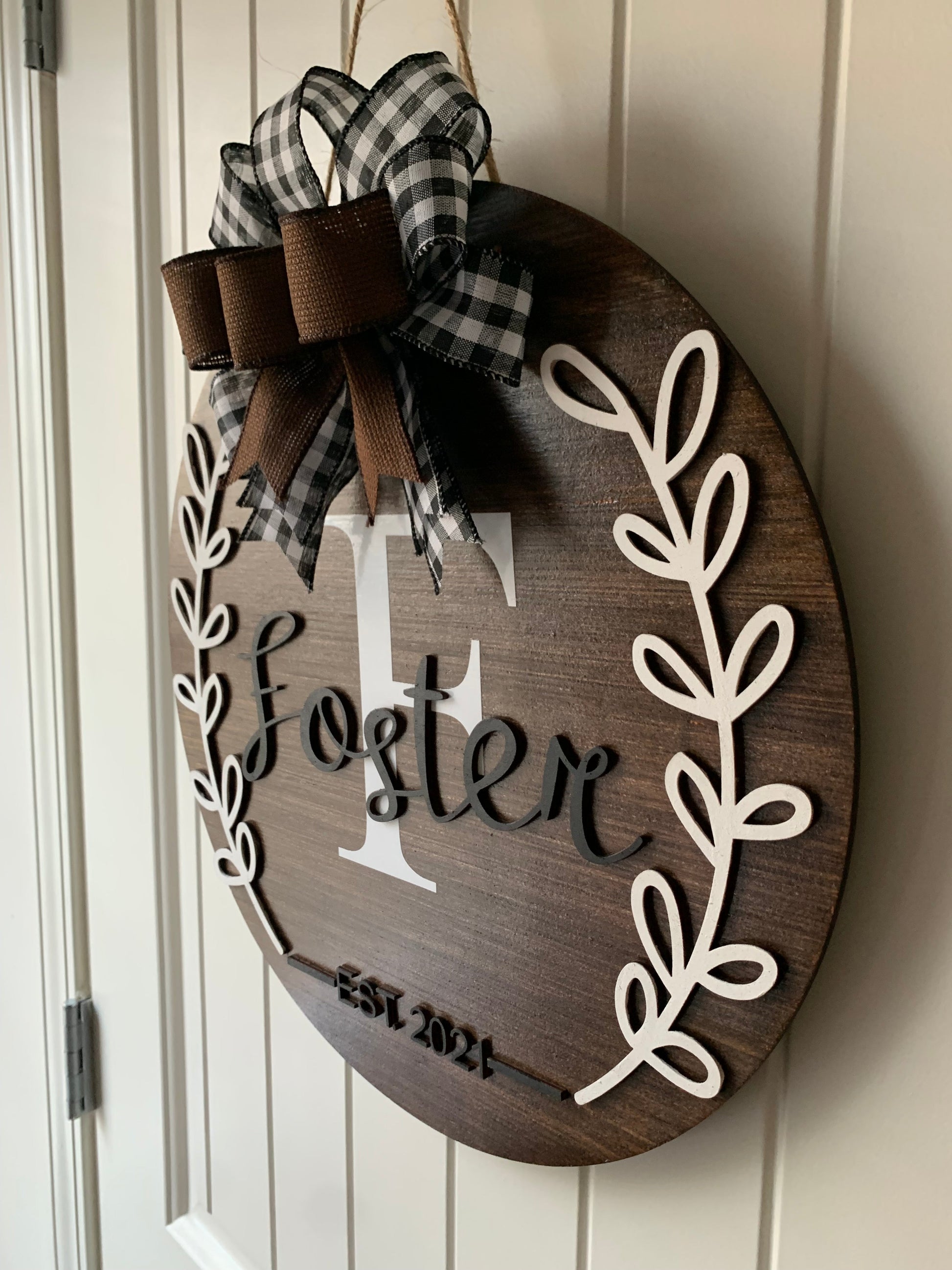 16 inches wood round sign. Can be customized with a name. +/- 1/4 in thick wood. Ribbon will coordinate with sign color.