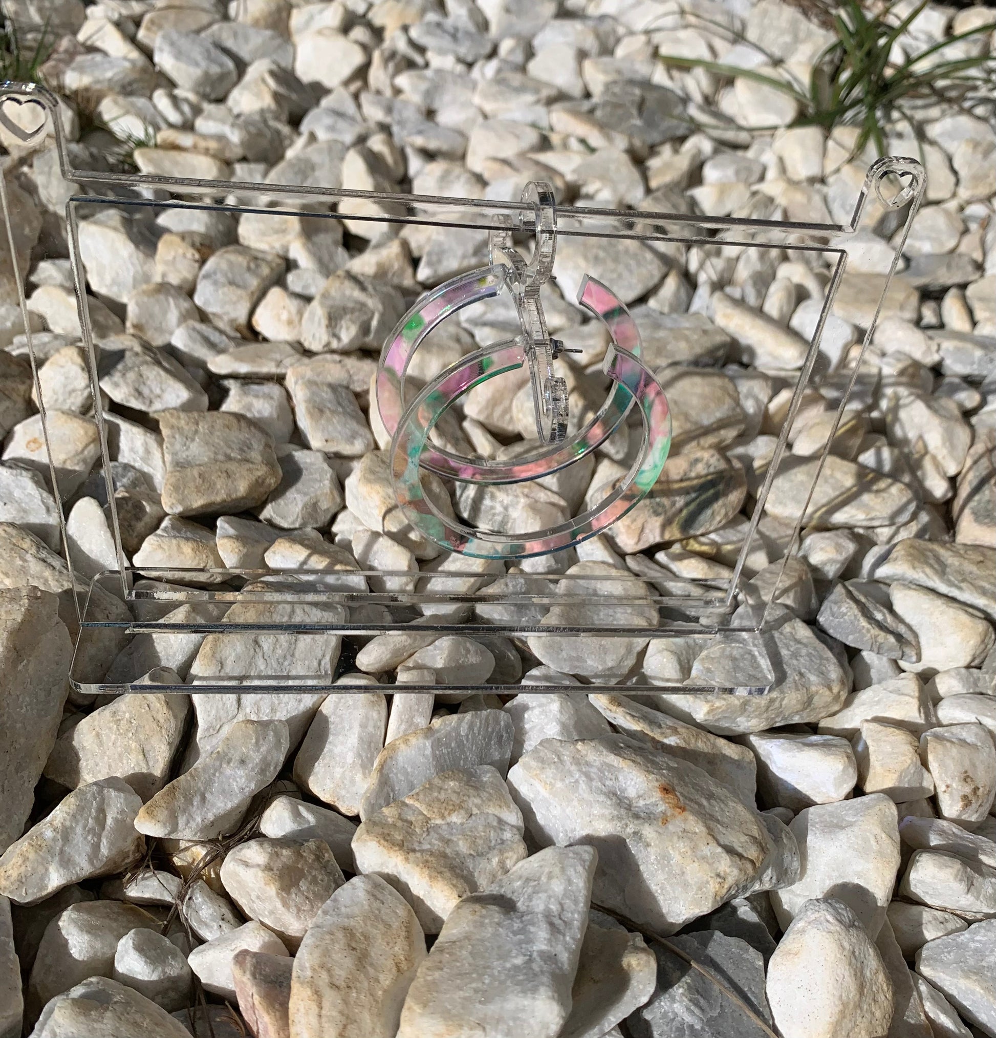 Large +/- 2 in Acrylic iridescent colored hoops. Stainless steel posts.