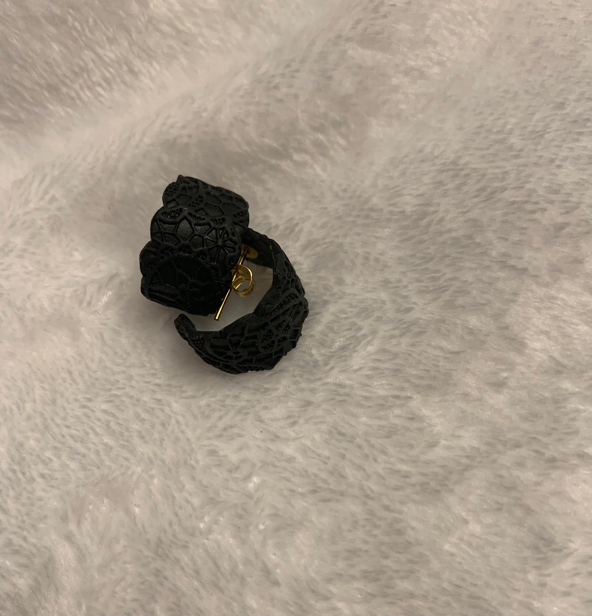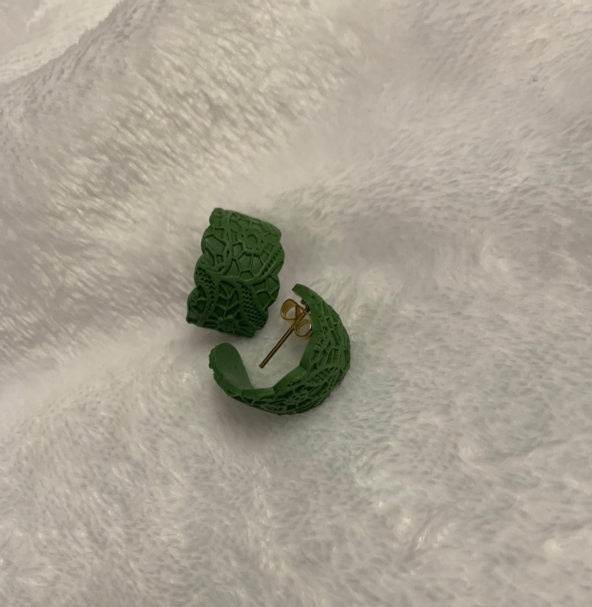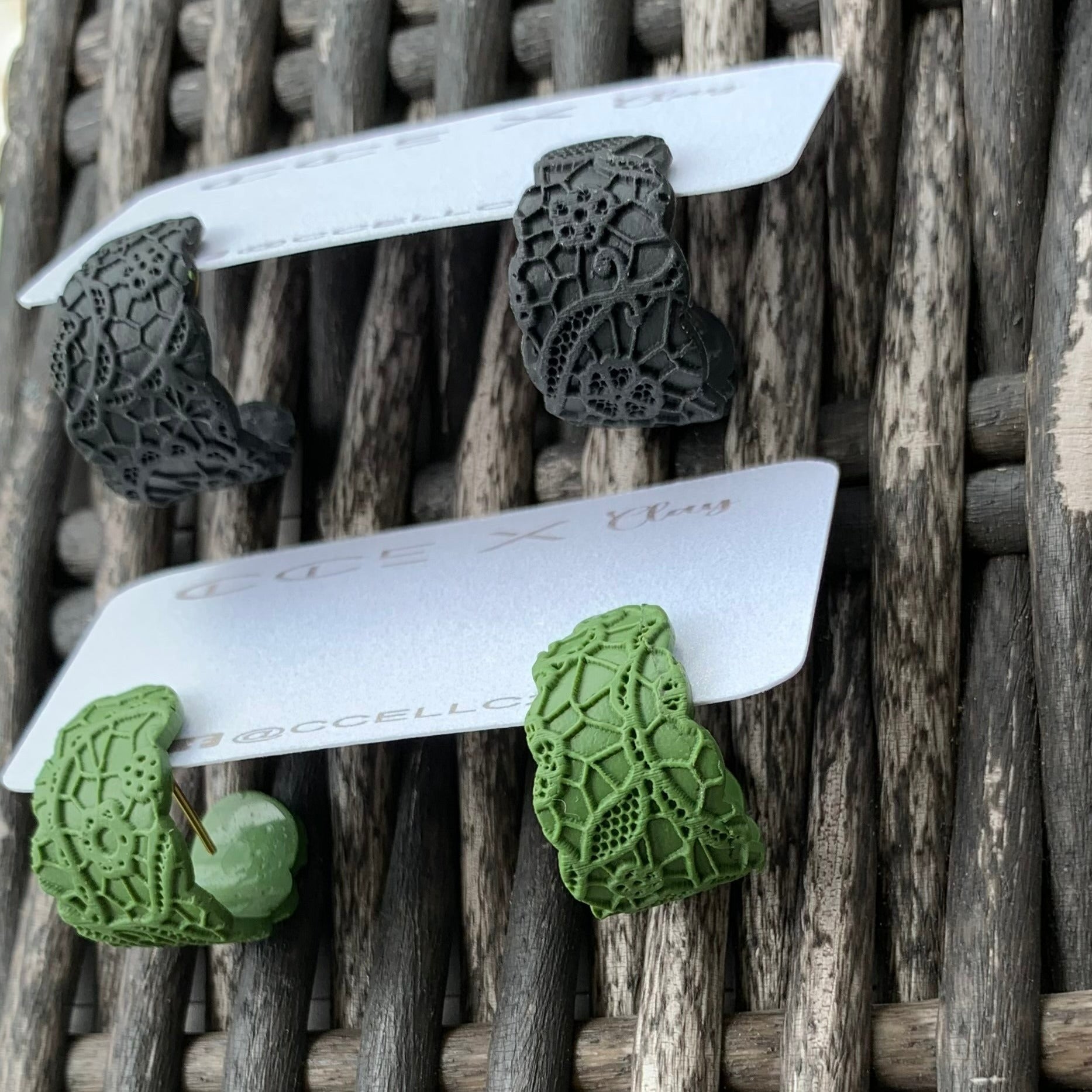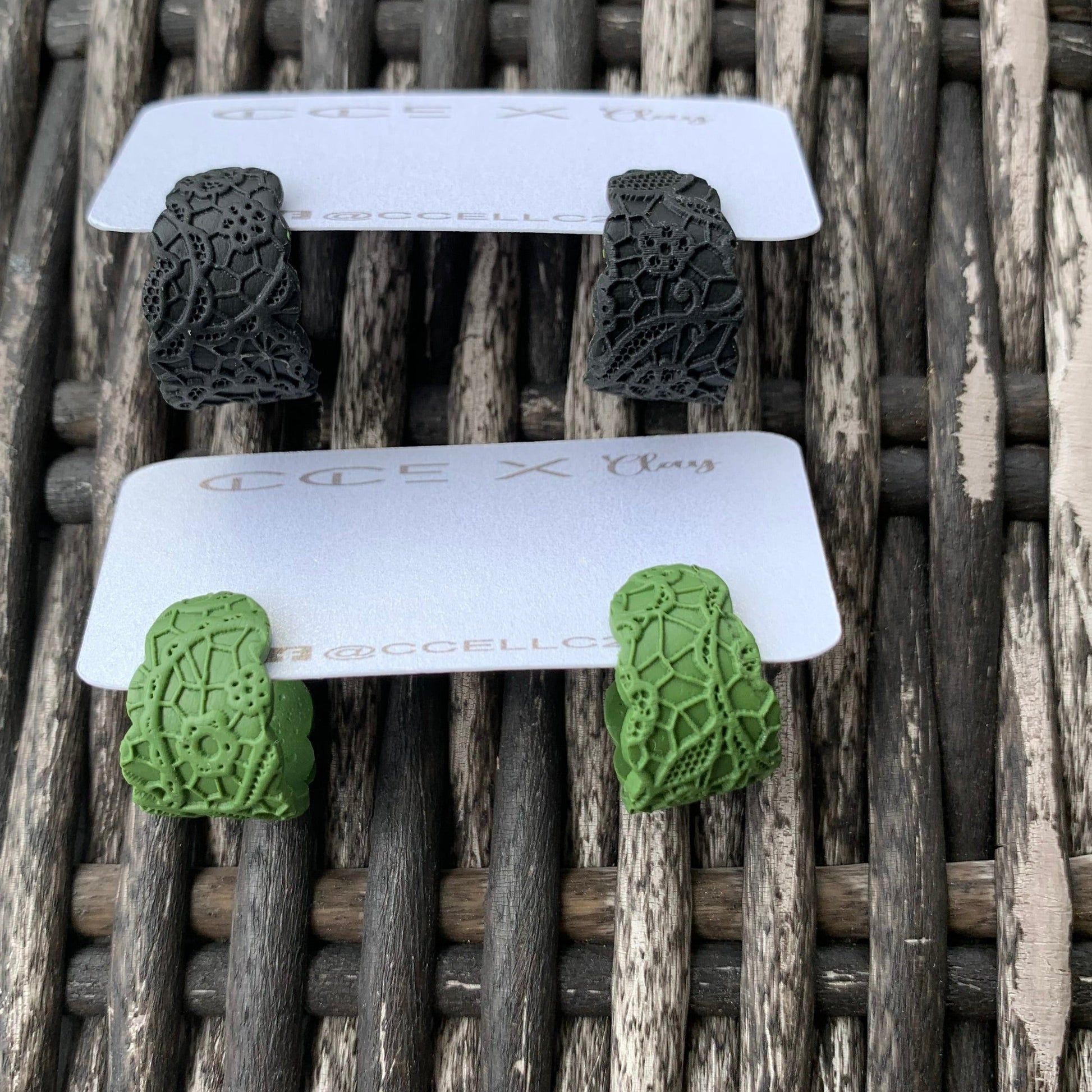Clay material in colors matte black and olive. Huggie style small hoops that stretches to cuff your ears. Hypoallergenic posts.
